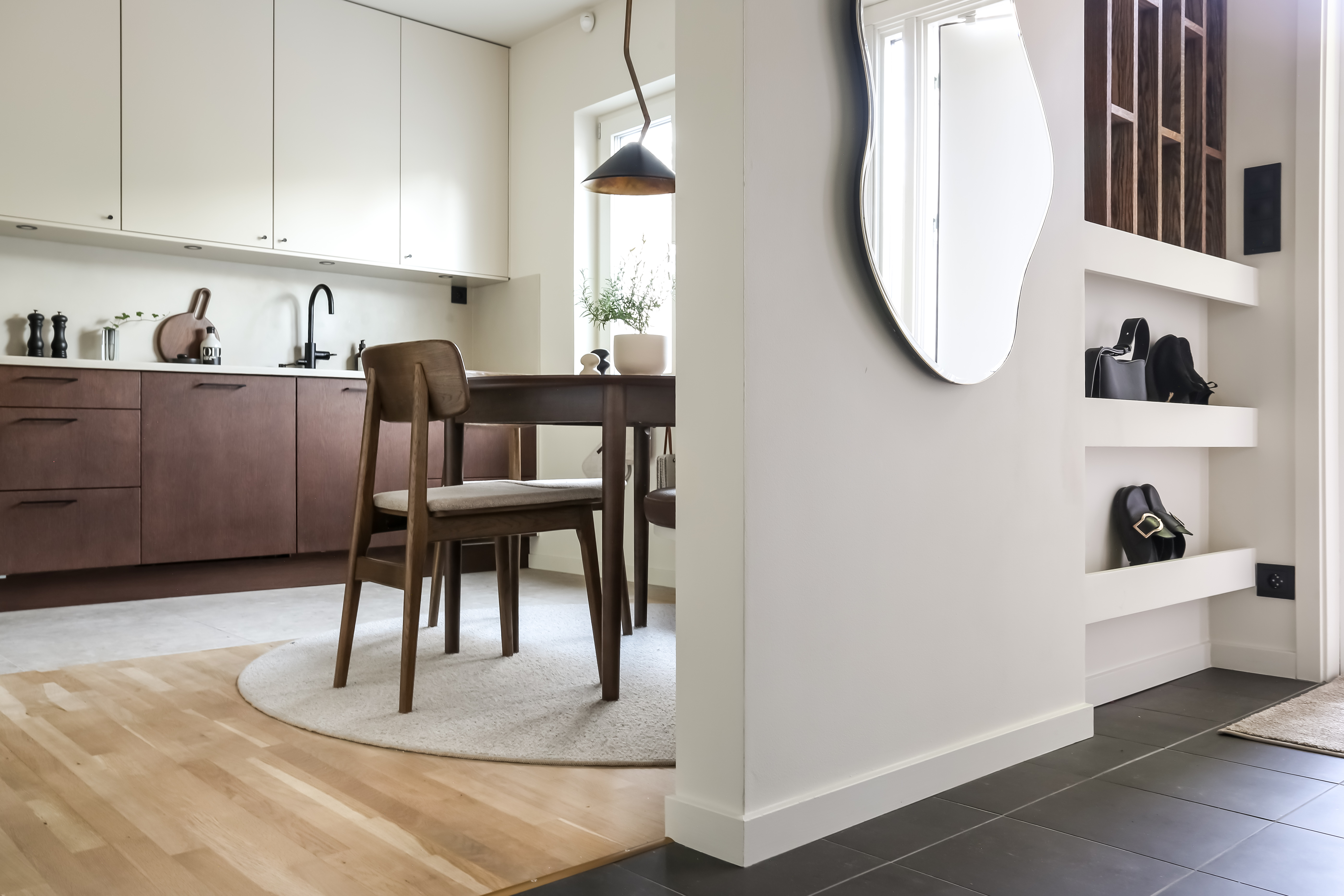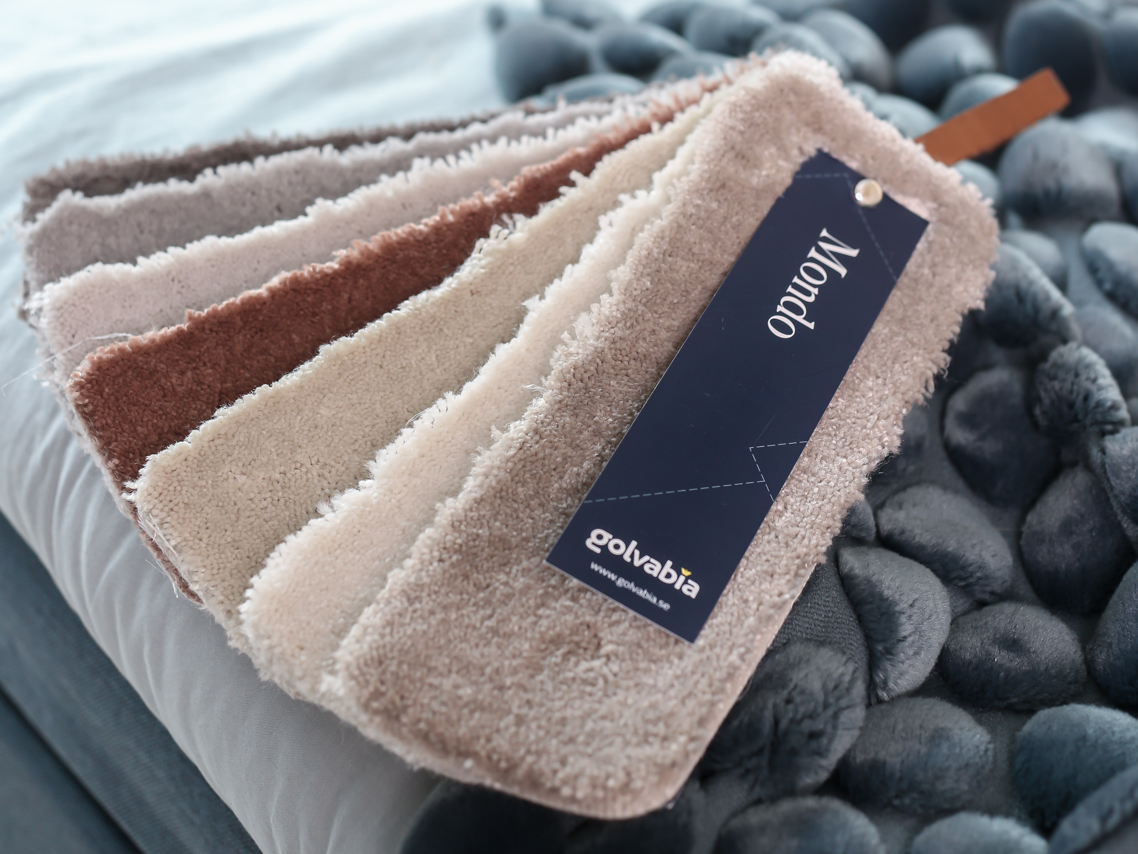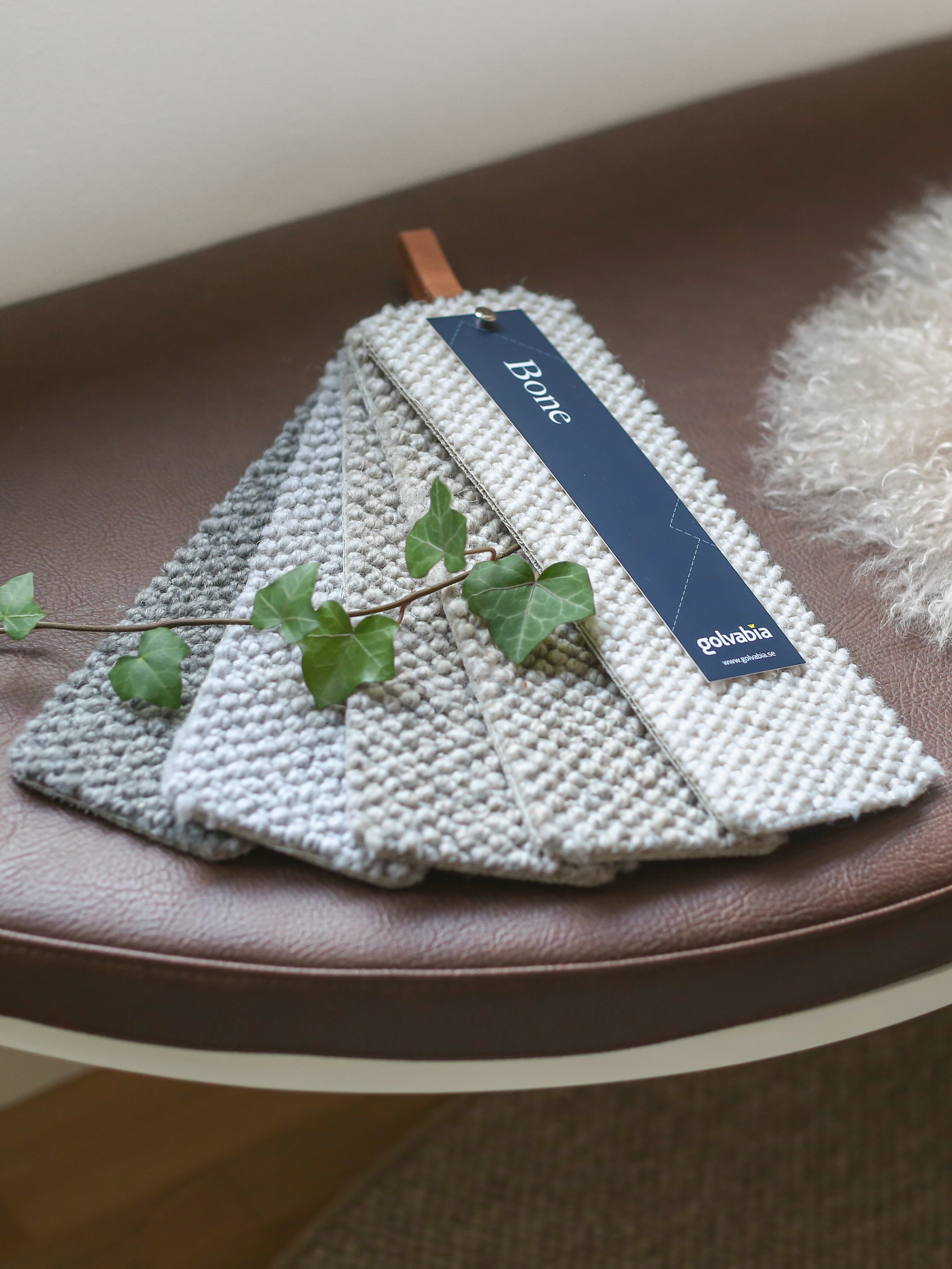 Ibland är det kul med mönster, blandade färger och strukturer, men till nya hemmet var jag ute efter mattor som ger en lugn bas och som funkade med övriga färger. Golvabia har många olika mattor och kulörer att välja på, men jag valde nya velourmattan MONDO i matsalen och även i sovrummet som heltäckningsmatta i vår Walk in Closet. I köket, hallen och i korridoren på ovanvåningen valde jag ullmattan BONE i färgen Sand, superfin!