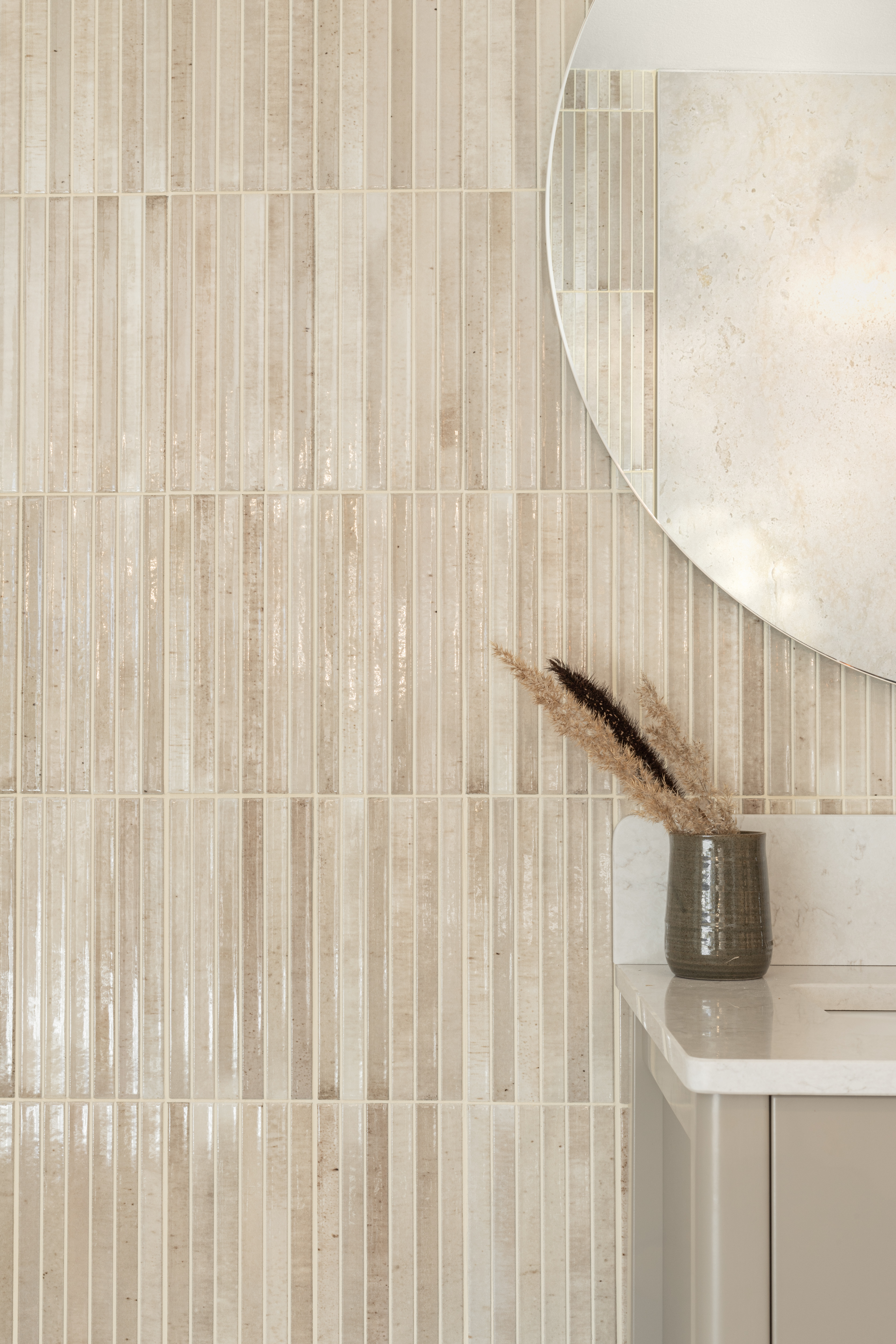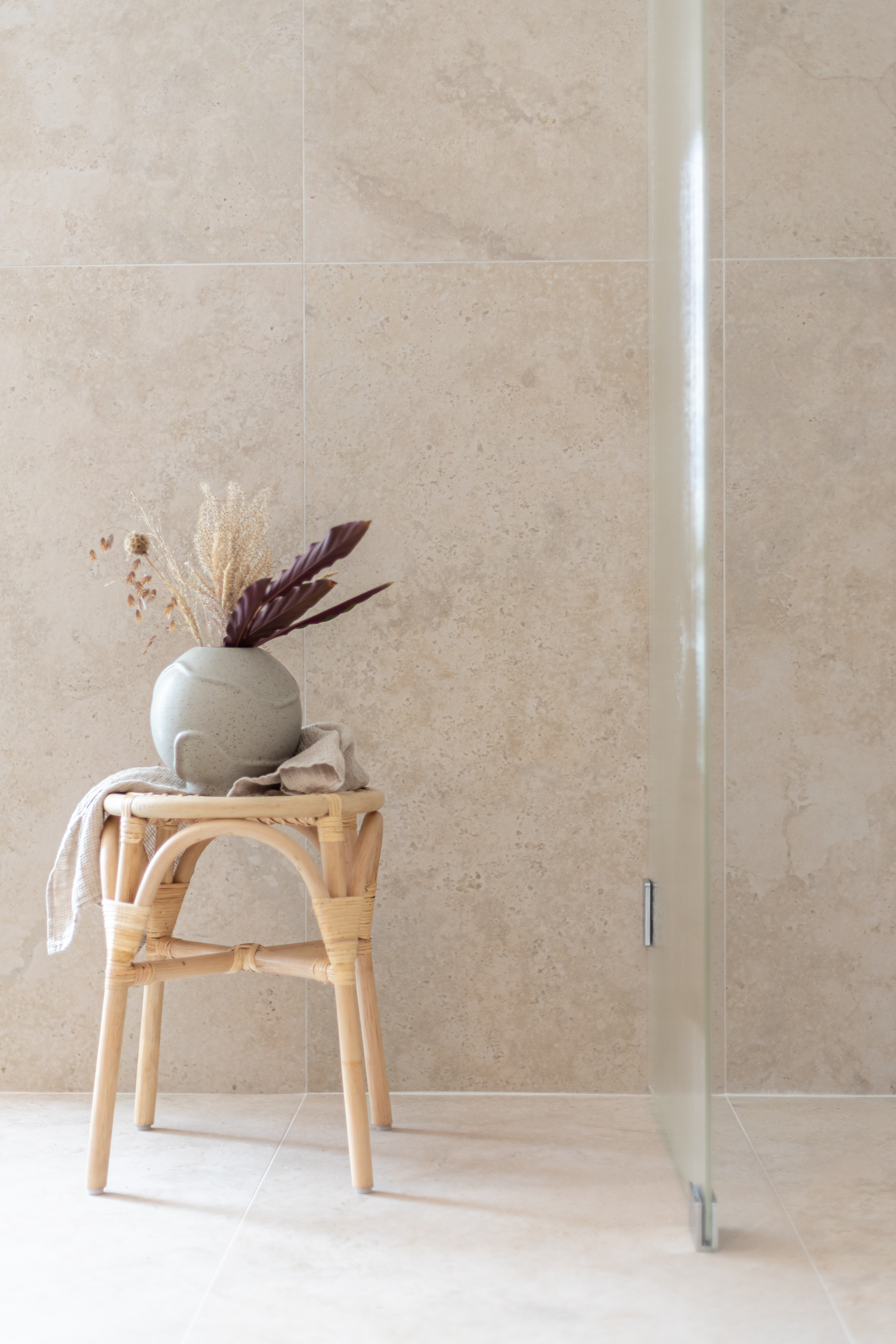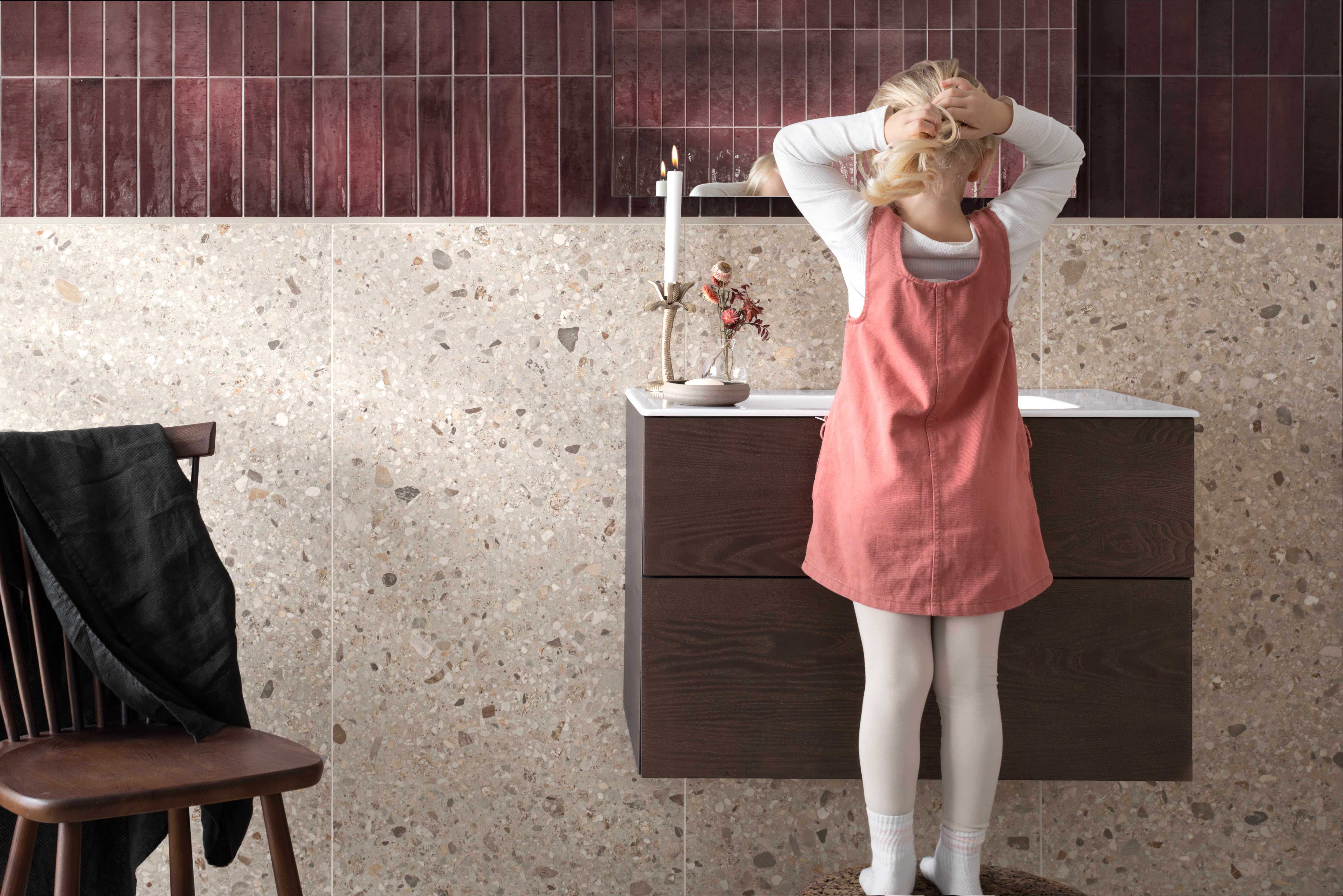 I stilen Värmande Trygghet möts du av ett badrum som omfamnar dig med terracottans glöd, röda toner som ger energi och mjukt beige nyanser som lugnar.