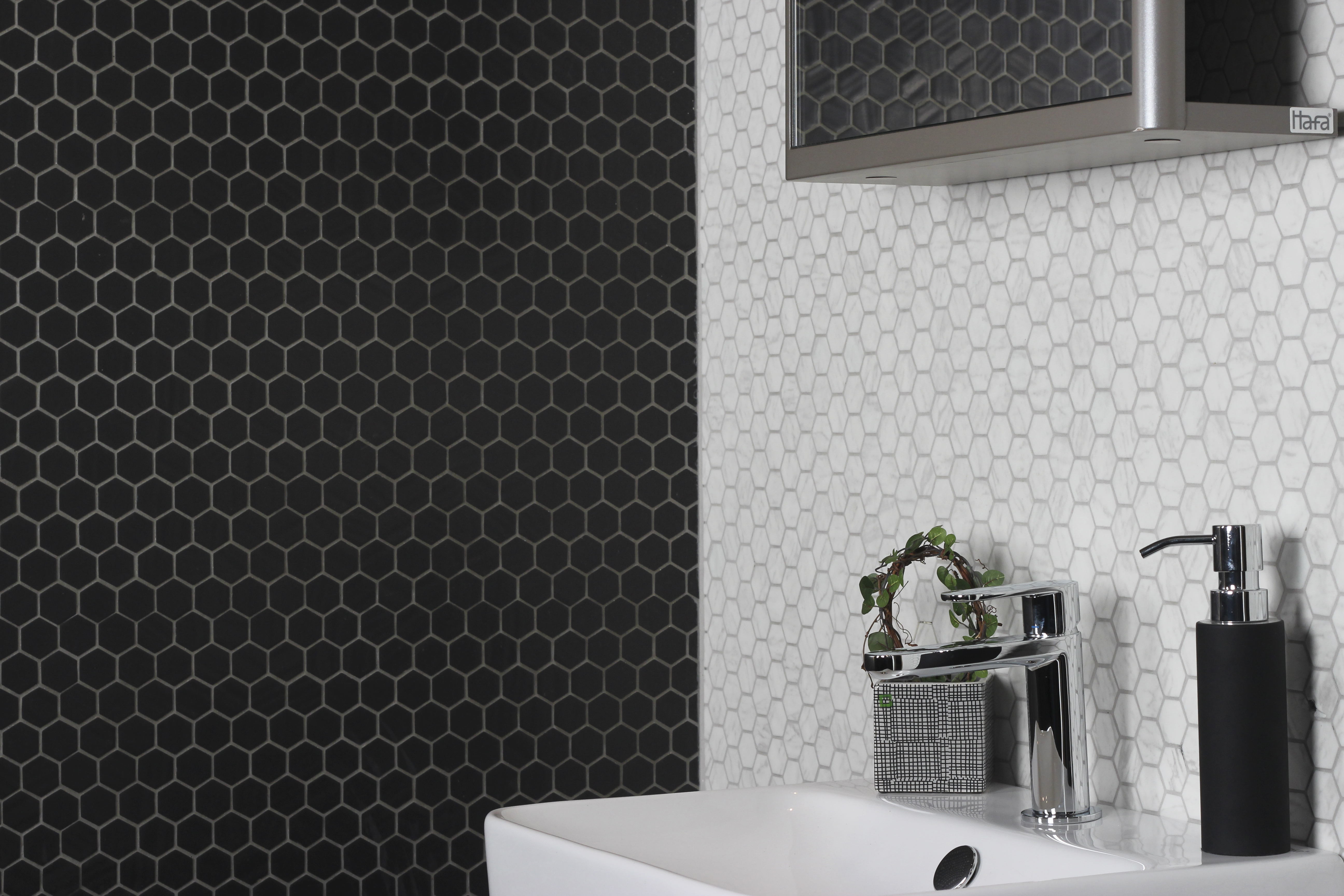 En spännande hexagon formad mosaik som ger ett retro utseende. Välj bland våra olika ytor och utseende.