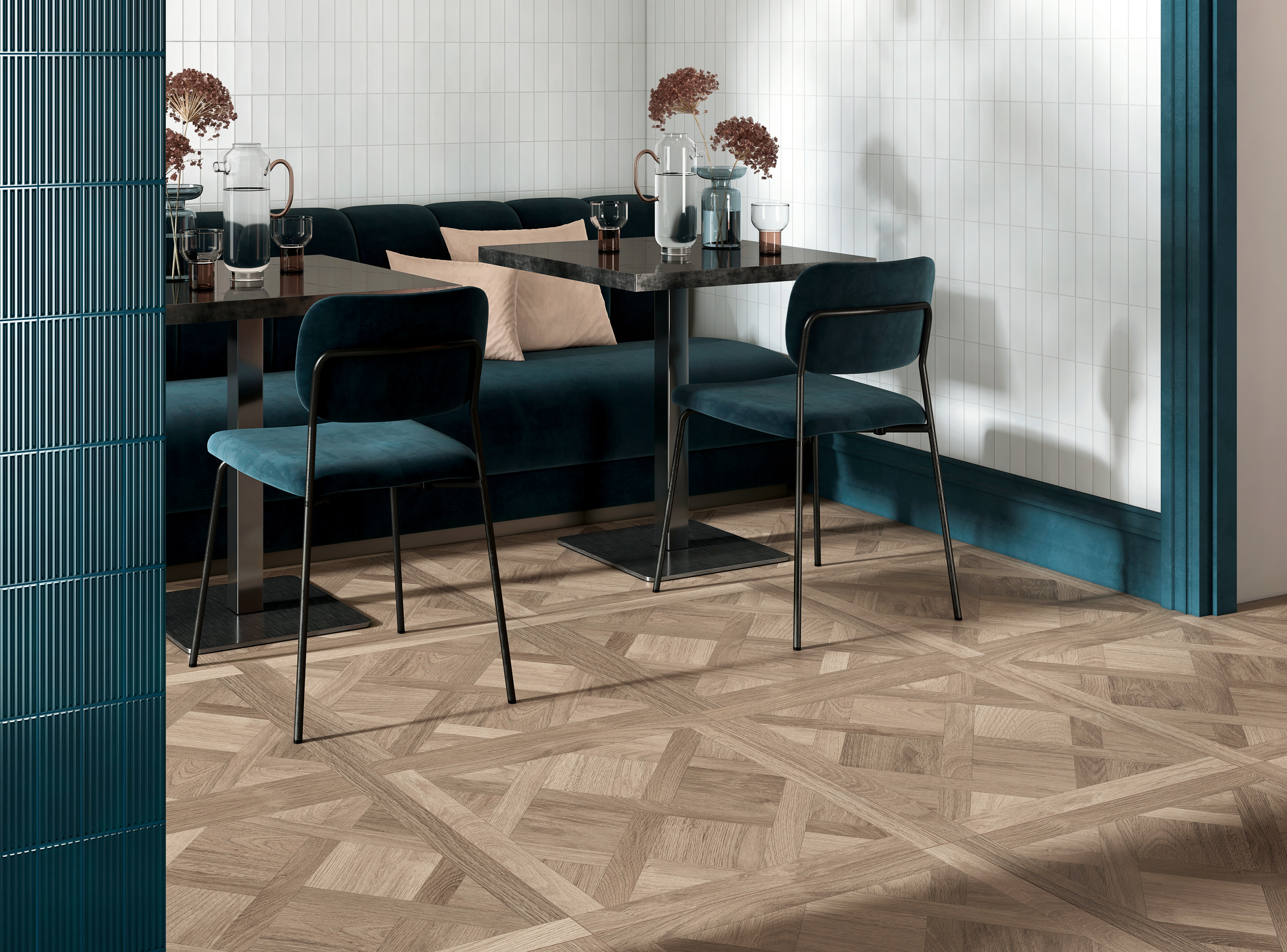 Tidlös charm som återskapar känslan av en traditionellt mönsterlagd stavparkett. Två välbalanserade färger, en i ljus och en i mörkbetsad ek. Färgerna tillsammans med den autentiska trästrukturen skapar ett uttryck som passar både moderna och klassiska miljöer. Lättinstallerad och slitstark, här förenas parkettens elegans med keramikens hållbarhet.