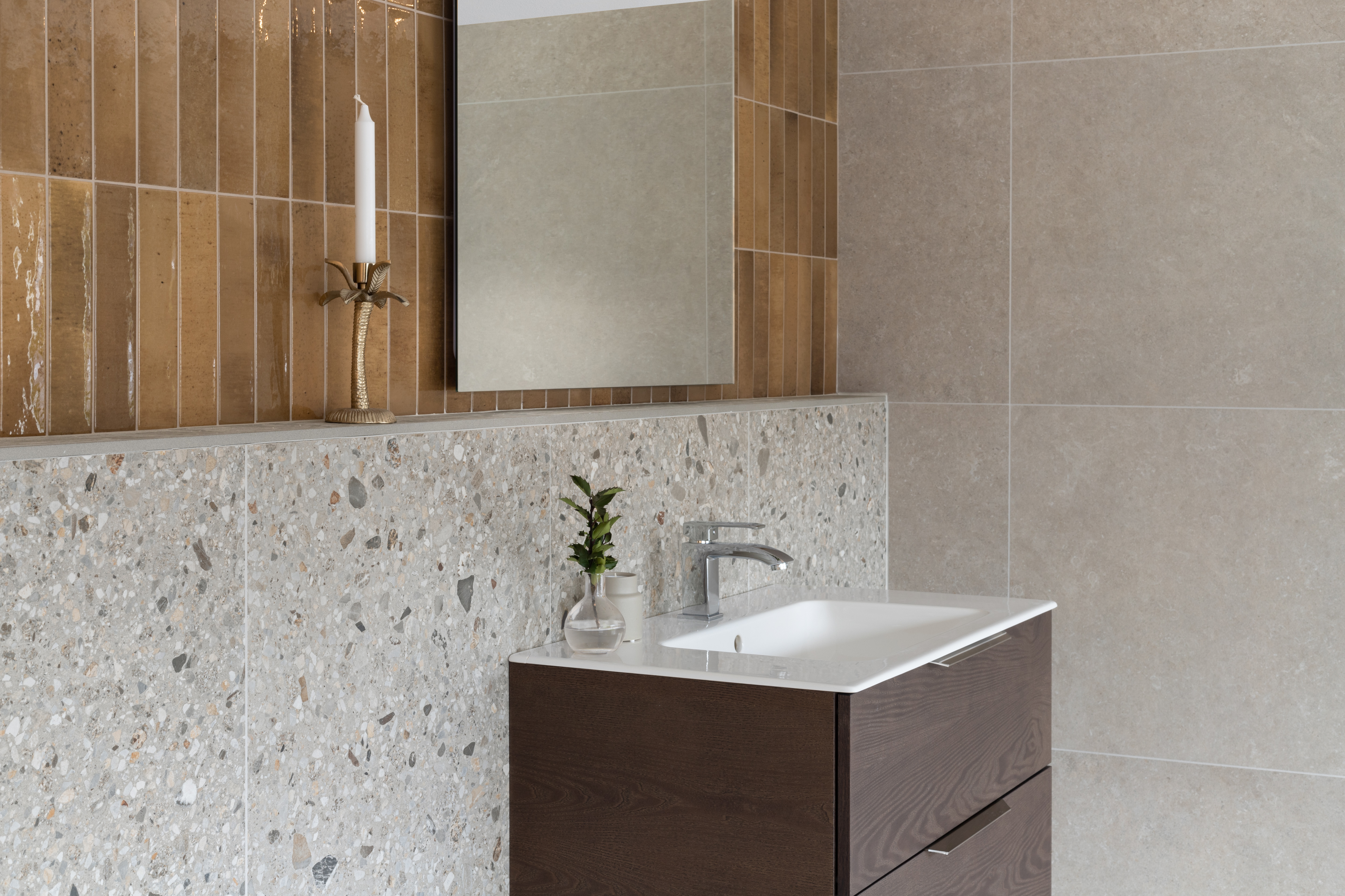 Klinkern Umbria erbjuder en fascinerande tolkning av det klassiska terazzomönstret. Grafiken i plattan blir magisk med en bottenfärg i kalkstensnyanser i kombination med kontrastrika flerfärgade flingor. Tillsammans med naturligt entoniga nyanser av basplattor kan du kreativt leka fram den bästa kombinationen för ditt badrum, golv eller kök. Seriens sortiment är generöst både i format och färger och kan enkelt kombineras även med en dekorativ kakelplatta.