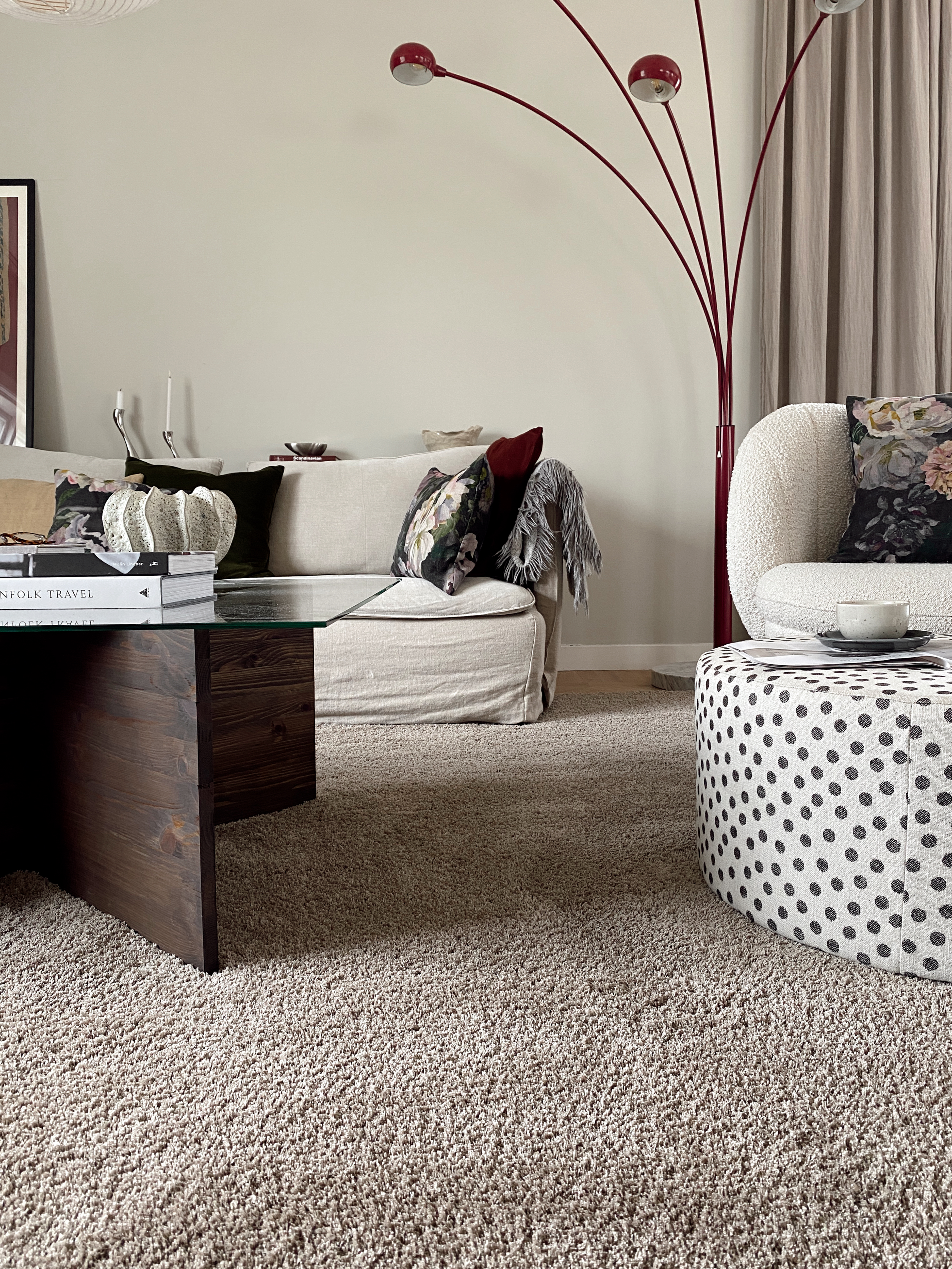 Bichon är en härligt tjock velourmatta hela 2800gr/m2 i garnvikt och hög lugg. En ombonad matta med sköna toner som lyfter soffhörnan till extra komfort. Bichon kantas ej utan luggen faller ut och döljer kanten och den unika baksidan gör att luggen inte trispas upp.